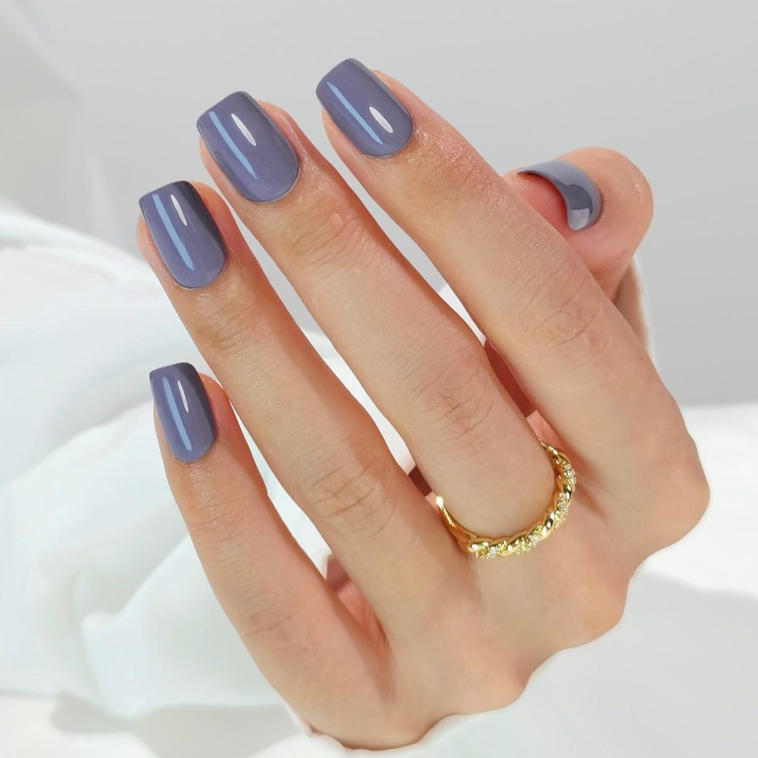 This design features a solid ash-gray, dusty blue shade with a glossy gel-shine finish.