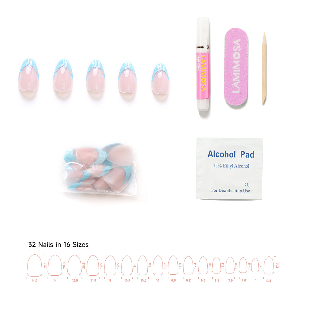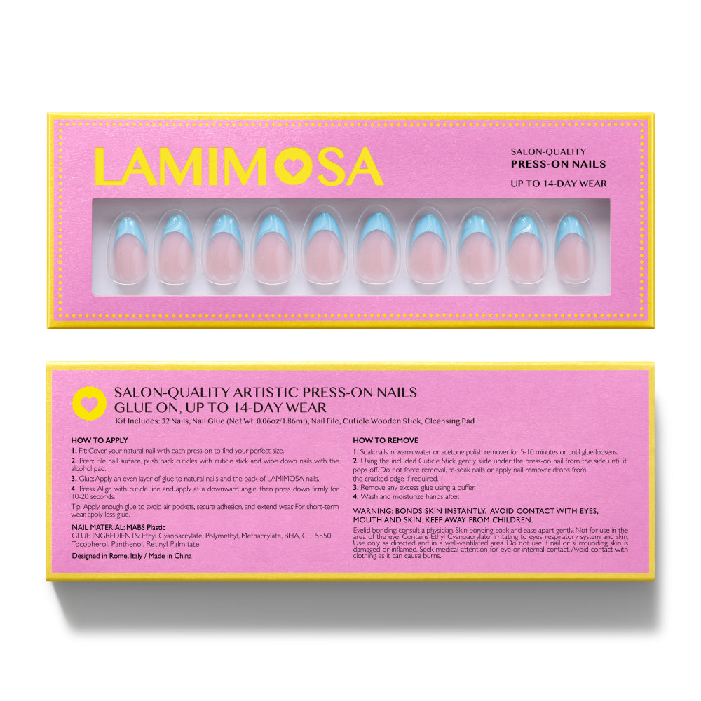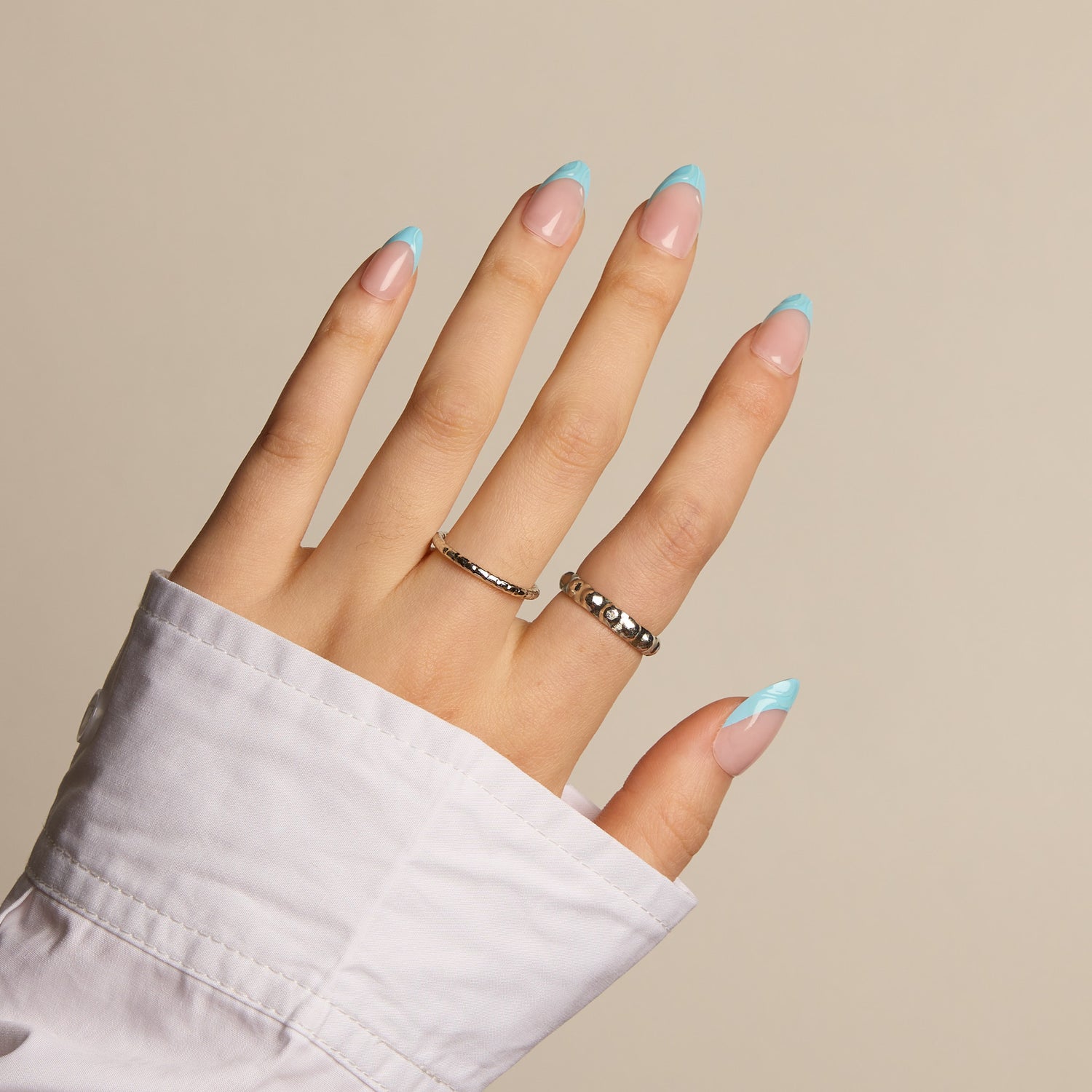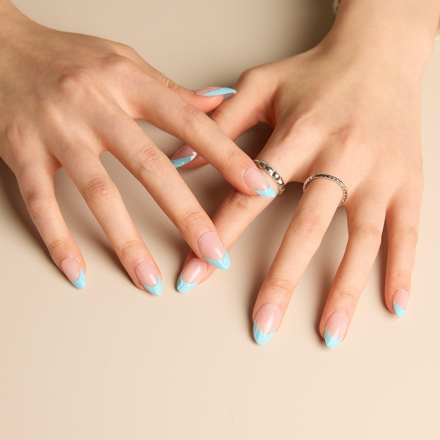 BLUE MOON nails blend ethereal elegance with a hint of serene charm. A transparent base captures light beautifully, while the soft blue tips evoke the calm glow of a moonlit night. The Gel-Shine finish enhances this delicate design, and the almond shape adds a touch of refined sophistication. Subtle yet captivating, these nails embody a quiet elegance and an air of tranquil allure.