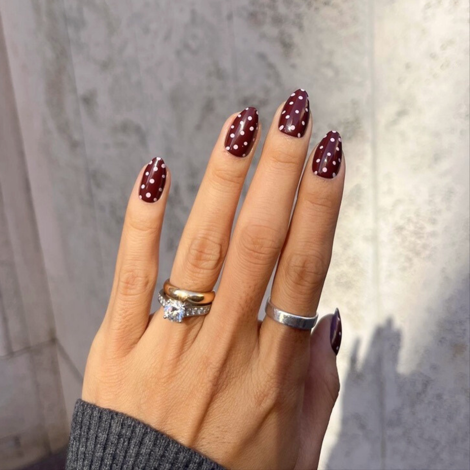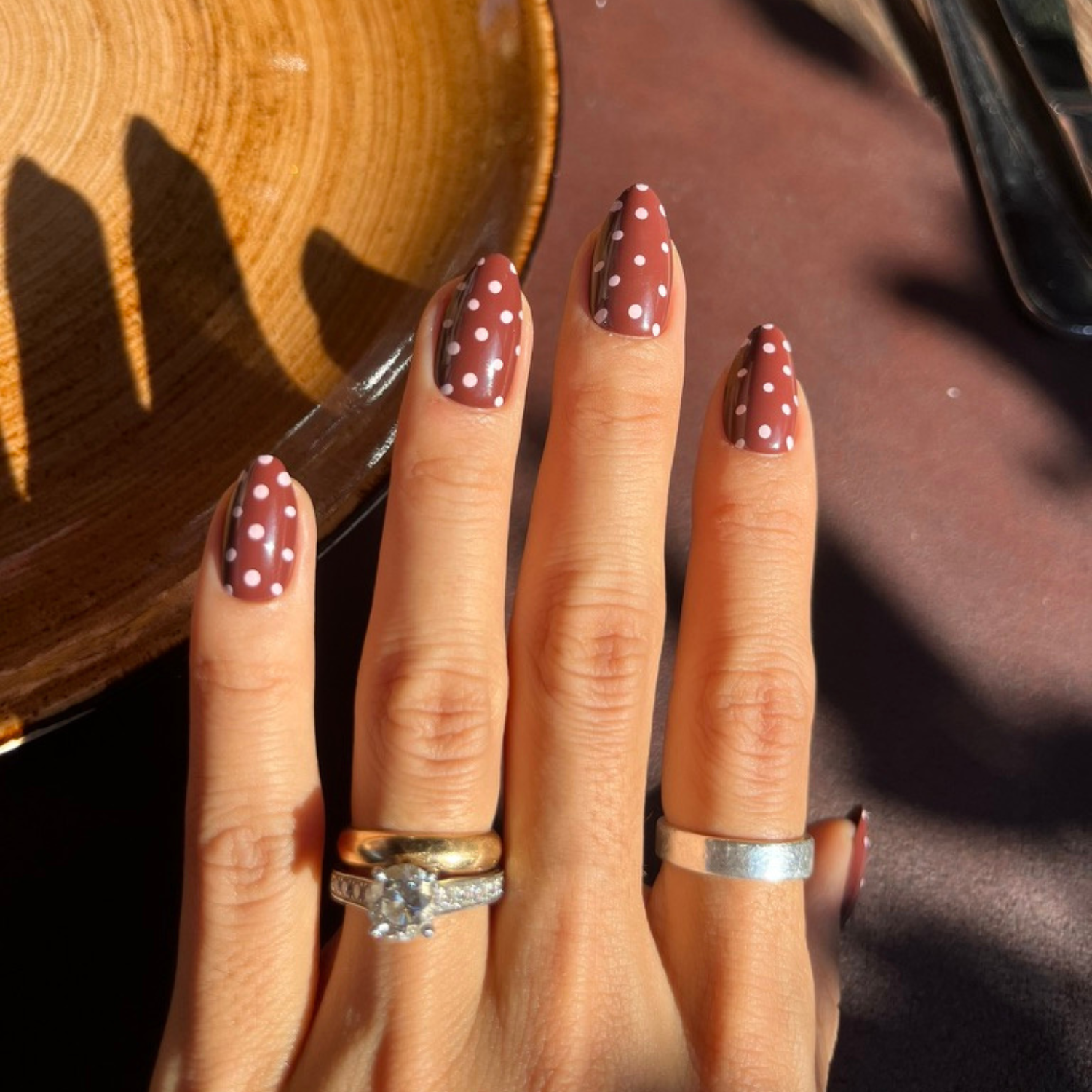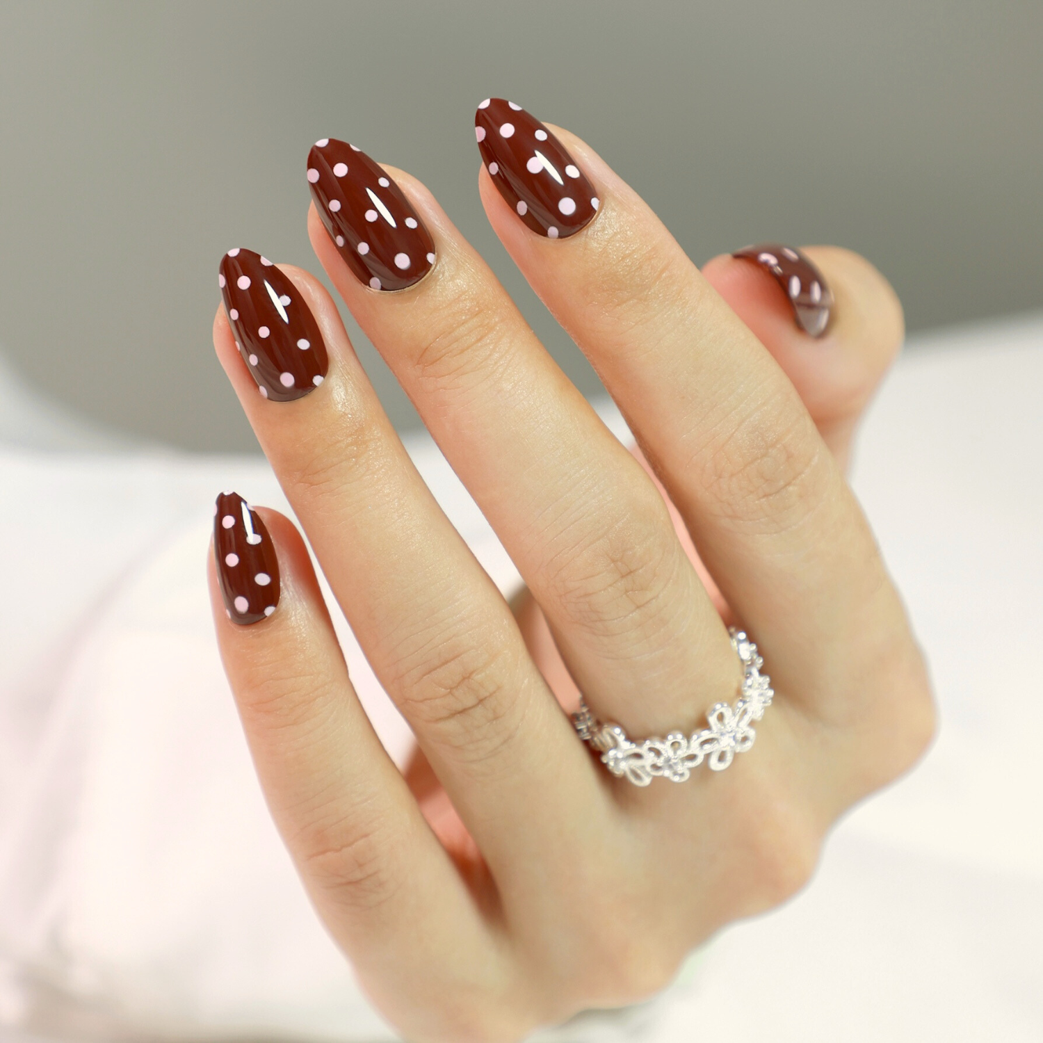 This design features a solid brown-red base adorned with cute pale-pink polka dots