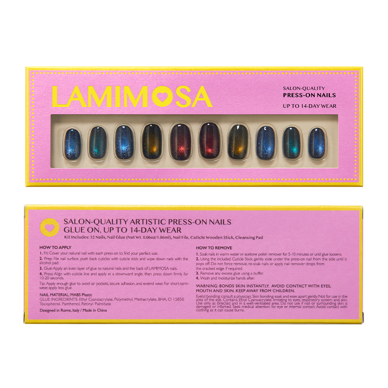 I will keep buying Lamimosa! As someone who’s been using press-on nails for a long time, I’m amazed by the beauty and quality of Lamimosa. The set on my hands looks even better than the photos they show! The cat-eye effect is so clear and stunning. This is truly my “perfect press-on match.”
