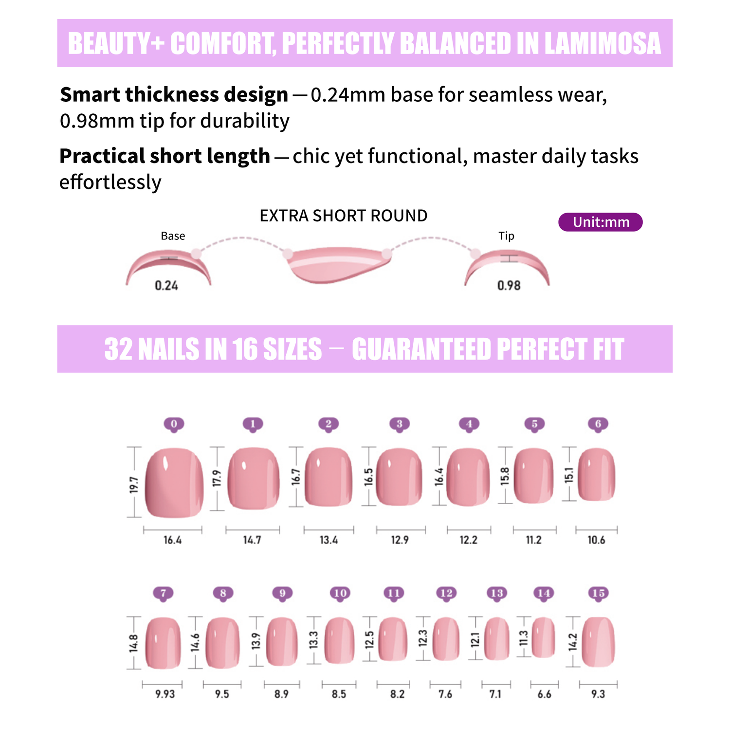 Each set includes 16 sizes - just match each finger and file if needed. We make it easy to find your perfect fit.