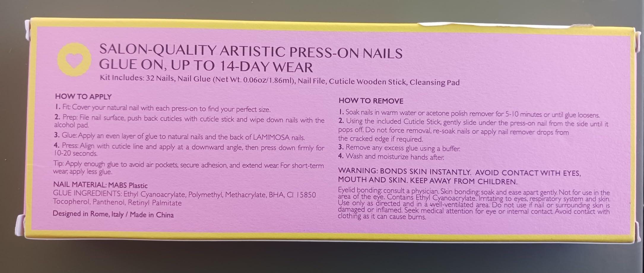 I like using press-on nails, as they're a quick and easy way to give myself a cute manicure (in the comfort of my home). I ordered this set of 'LAMIMOSA' press-on nails, and am very pleased with how nice they are.