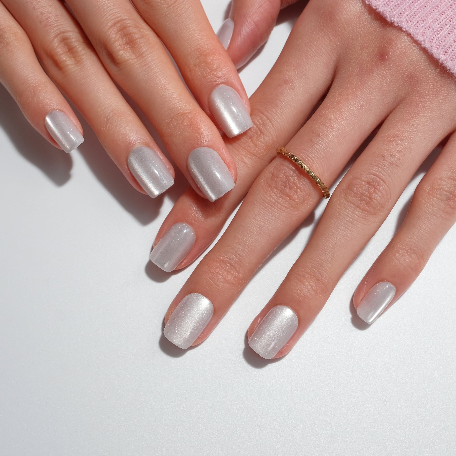 Features a white cat-eye effect on a milky white base that sparkles like glittery snow.