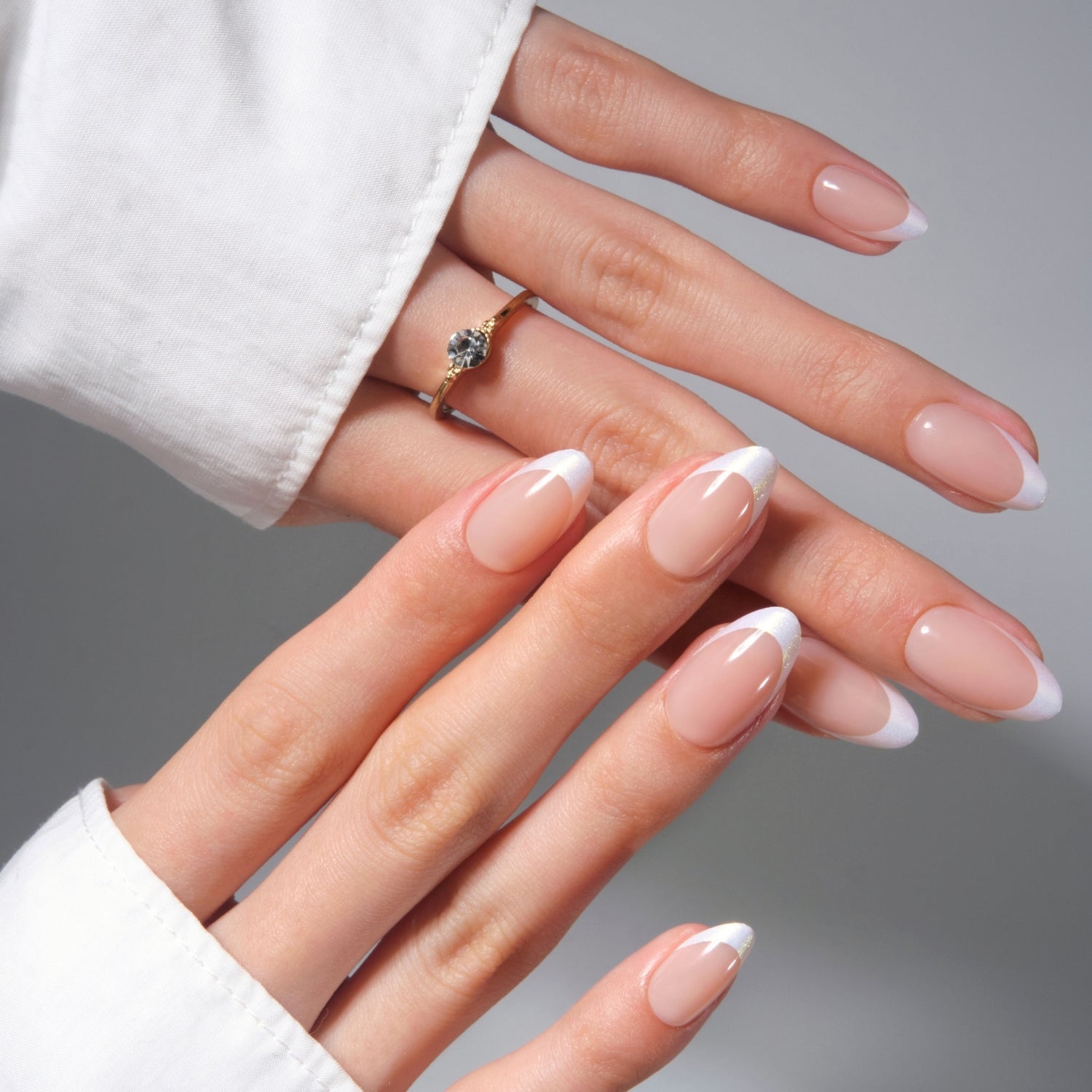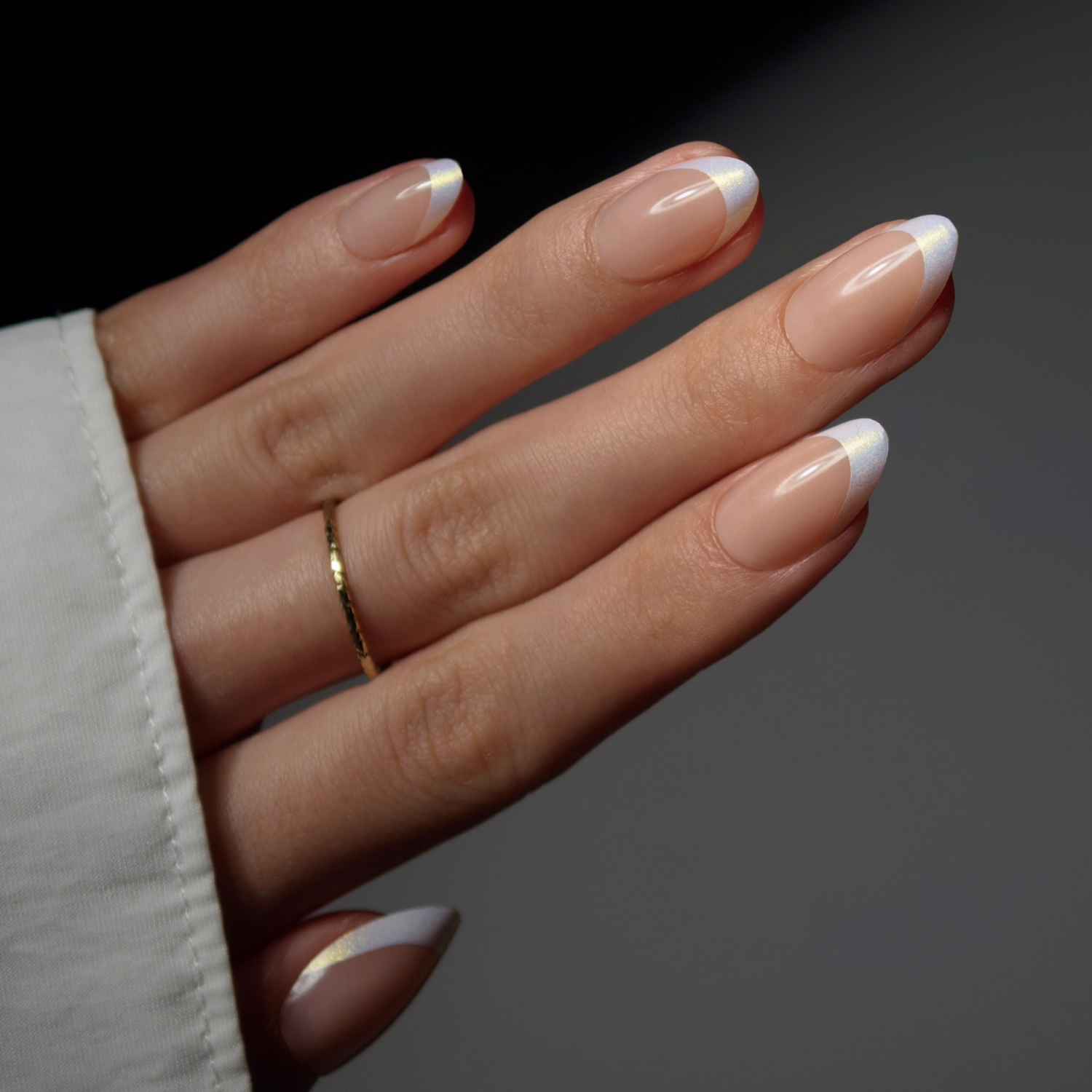 - Finish: Gel Shine + classic French tips with a subtle iridescent finish